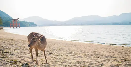 התפעלו משער הטוריי האדום והעצום של מקדש איצוקושימה, המשתקף במים בזמן שאתם מטיילים סביב האי, בליווי איילים פראיים המשוטטים בחופשיות.