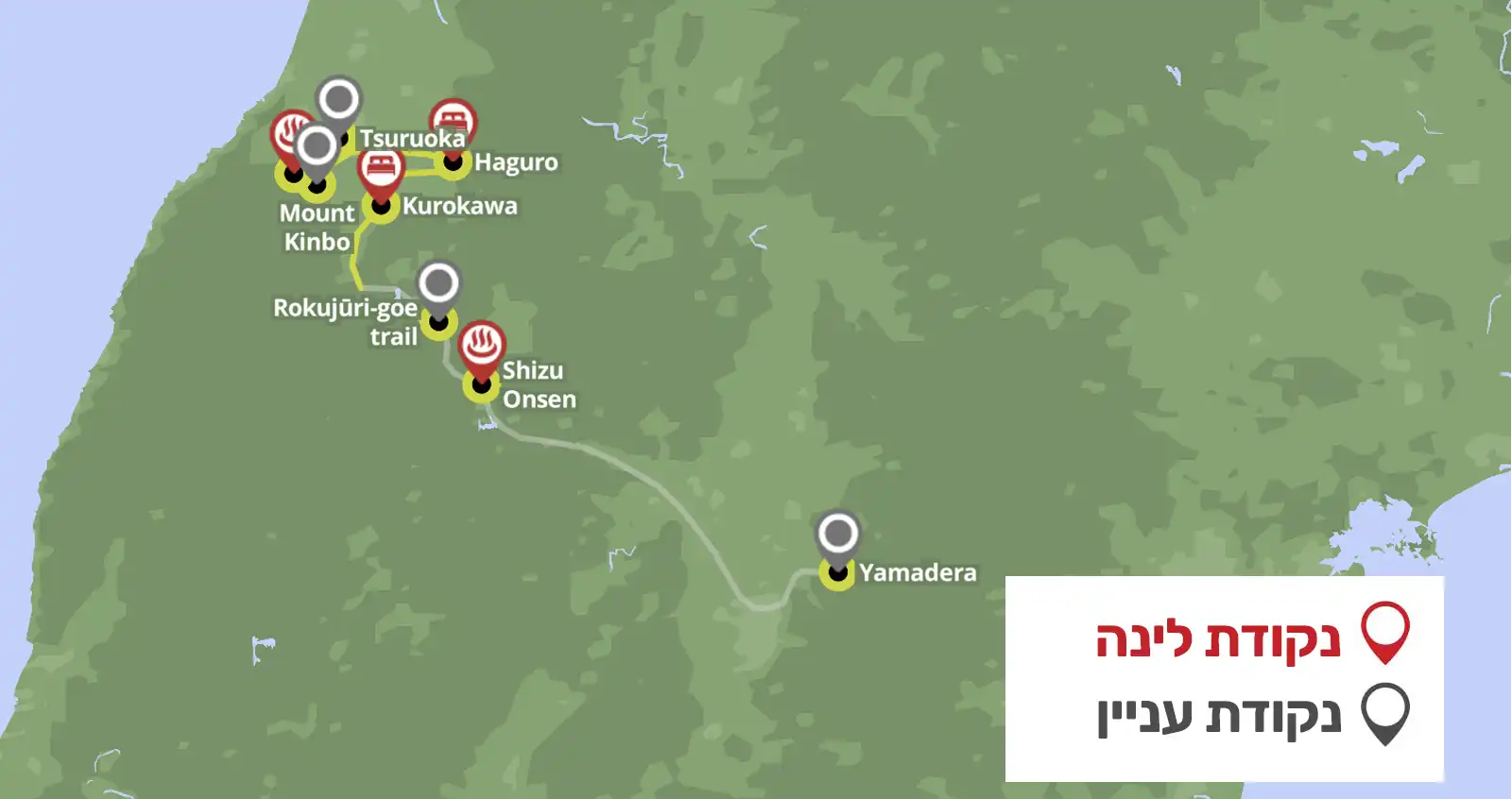 הטיול כולל ביקור בהר האגורו ובמקדש הר יודונו הראשון והשלישי מבין שלושת הרי דווה (Dewa Sanzan). הליכה מודרכת אופציונלית להר גסאן, ההר הקדוש השני מבין השלושה, זמינה לפי בקשה ובתוספת תשלום. שימו לב: האפשרות תלויה בזמינות ובתנאי השטח והעונה; מומלץ לפנות לצוות מומחי היעד שלנו לקבלת מידע נוסף.