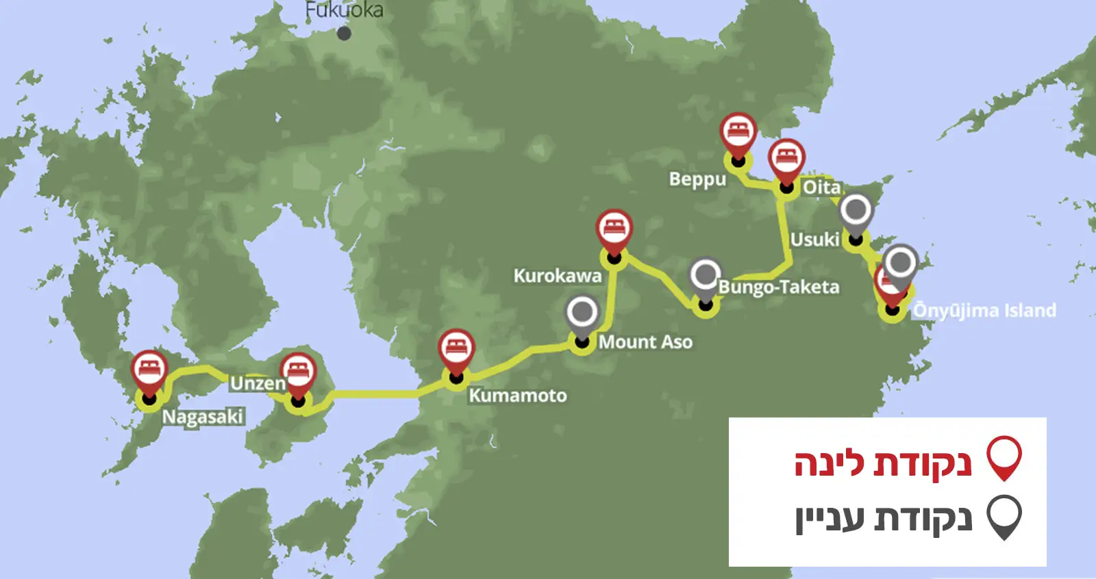 המסלול משלב חקירה, הליכה ולמידה, ומתאים למי שמבקש להבין לעומק את מקומה הייחודי של קיושו בהיסטוריה היפנית. שלושה מסלולי הליכה מובילים לתצפיות עוצרות נשימה – באי אוניושימה, בהר אסו ובהרי אונזן – לצד ימי חקירה בערים ואזורים בעלי חשיבות תרבותית כמו טאקטה ונגסאקי.